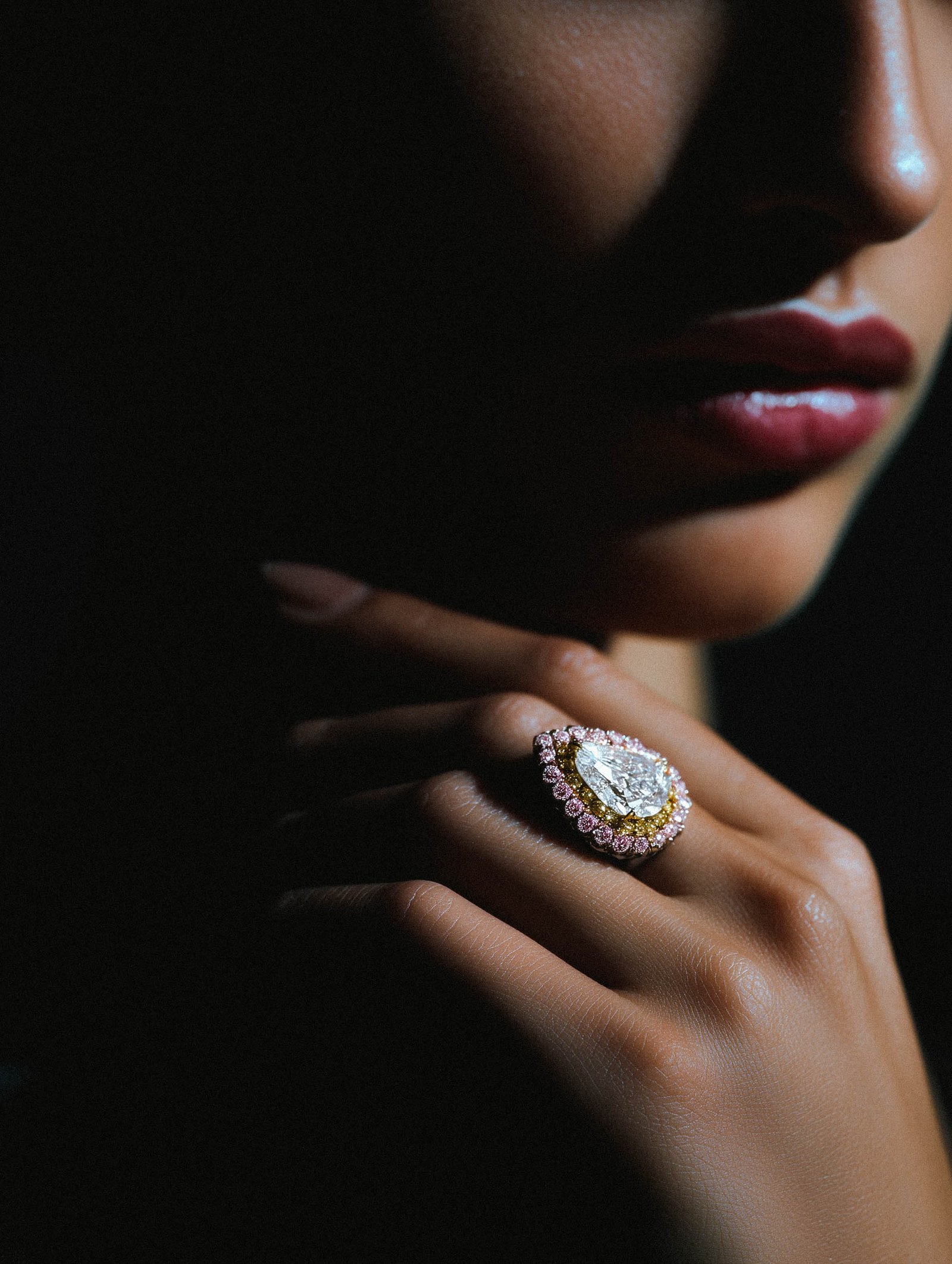 The centerpiece defies convention—a magnificent 12-carat pear-shaped diamond of D-color, internally flawless clarity that seems to generate its own light source. But it's the supporting cast that transforms this from exceptional to legendary: two flanking pear diamonds of 4 carats each, creating a crescendo of brilliance that flows like frozen music.